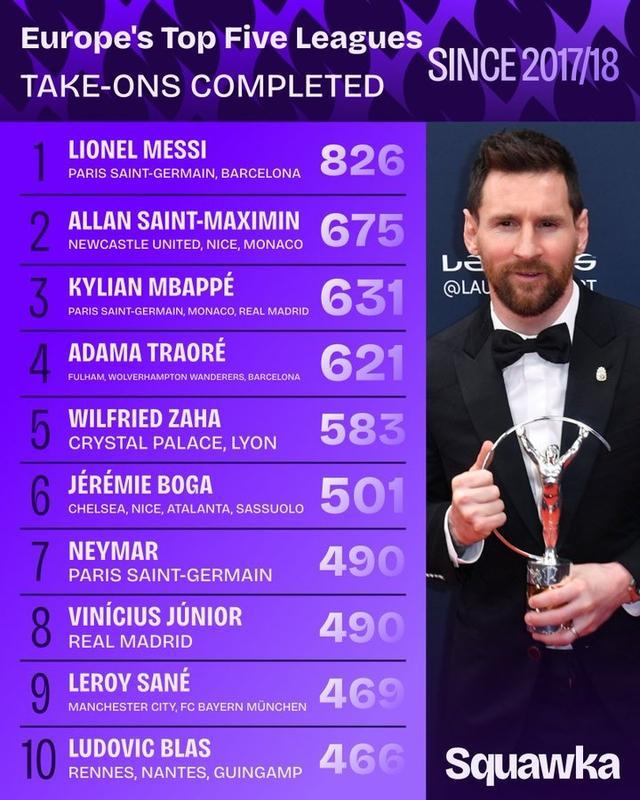 直播吧9月6日讯 Squawka统计了自2017-18赛季以来,欧洲五大联赛球员的过人次数排名,梅西826次位列第一。2017-18赛季至今五大联赛球员过人排名:1、梅西,巴黎/巴萨,826次2、圣马克西曼,纽卡/尼斯/摩纳哥,675次3、姆巴佩,巴黎/摩纳哥/皇马,631次4、阿达玛-特劳雷,富勒姆/狼队/巴萨,621次5、扎哈,水晶宫/里昂,583次6、...